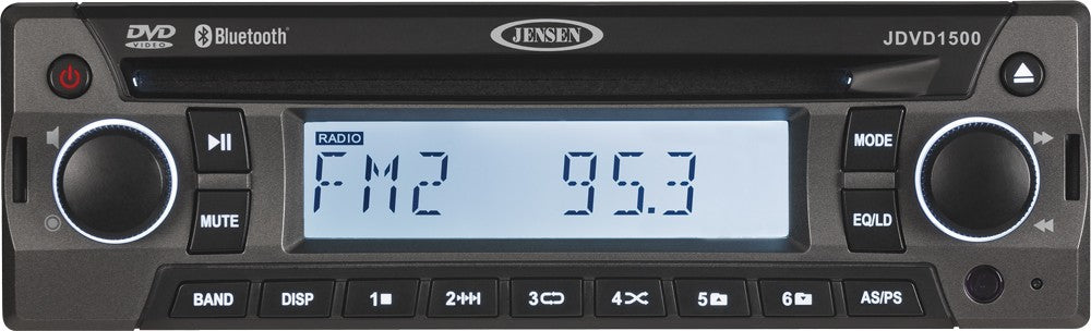 Model: jDVD1500Watch all your favorite movies and enjoy mobile audio entertainment with JENSEN's next generation 12 Volt DVD player. The JDVD1500 12 Volt DVD Player sports a standard DIN size chassis making it compact and capable of fitting in any convenient location. In addition to being a fully functional DVD player, the JDVD1500 also allows for AM/FM entertainment and Bluetooth® connectivity from a Bluetooth® enabled source